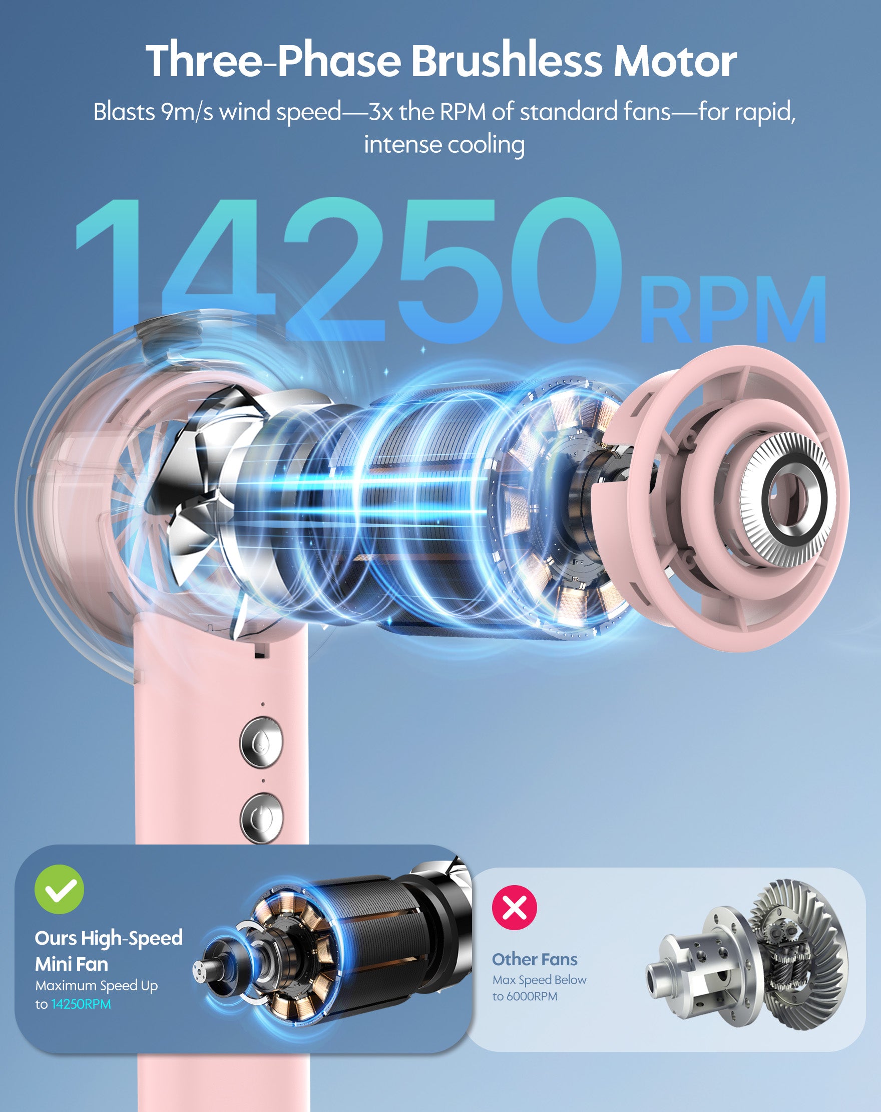 • High-Speed 14250 RPM Motor & Nano-Misting Spray: Engineered with a 6-blade turbine and powerful three-phase brushless motor, this misting fan blasts 9m/s wind speed—3x the RPM of standard fans—for rapid, intense cooling. Nano-mist technology emits ultra-fine droplets that deliver instant refreshment without dampness, making the handheld turbo fan ideal for instant relief during hikes, commutes, sports, or scorching summer days. Stay cool, comfortable, and ready for adventure—anywhere, anytime