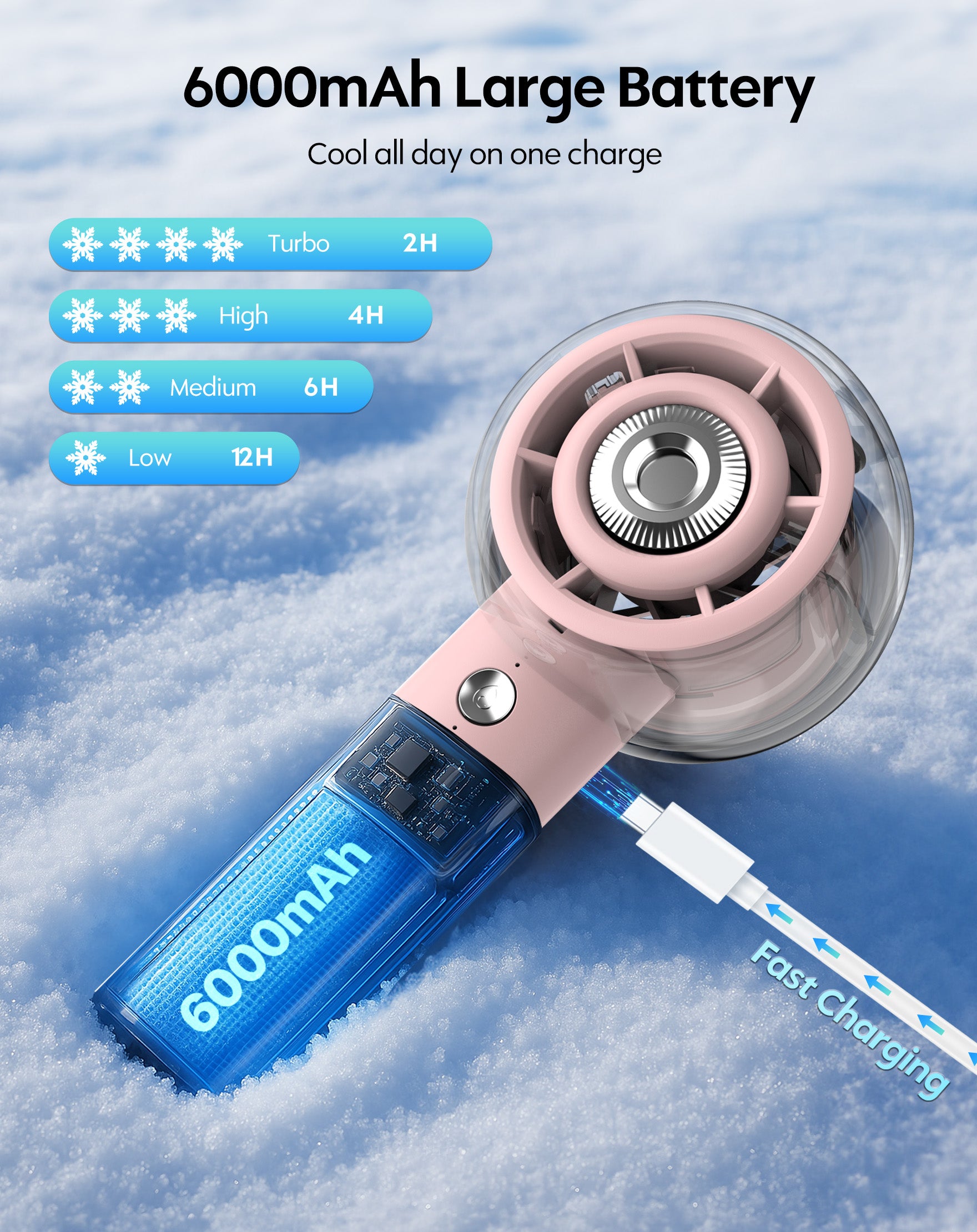 • Long Lasting Cooling with 12 Hours Max: Built-in a high-capacity 6000mAh rechargeable battery, this portable misting fan delivers up to 12 hours of continuous runtime on a single charge. Recharge fully in just 3 hours using any USB-compatible port, laptop, car charger, or power bank, ensuring versatile, on-the-go power access. Enjoy all-day cooling comfort during beach trips, camping adventures, or commutes without frequent recharging—plus seamless charging flexibility wherever summer takes you